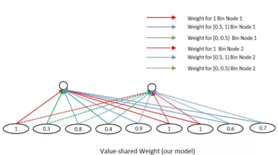 aNNM-2相对于aNMM-1的改进是,使用多个基于值的权值网络,就像CNN有多个滤波器一样,这样做可以提取多方面的特征。因为隐层的结构由M*1 变成了M*k,其中k为 共享权值的组数,为了让网络的结构与aNMM-1 尽可能相似,aNMM-2 多了一个隐层,即将从第一个隐层学到的多个分值合并起来,其他结构没有改变,结构如下所示: