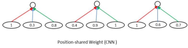 2. 使用基于值的权值共享将匹配矩阵编程相同维度。CNN的关键思想是,相对位置一致的一些结点权值共享,这也是基于图像的像素点和周围像素点关系很大的假设之上的。使用基于位置的权值共享时,可表示成如下所示,其中同样颜色的边表示相同的权值。