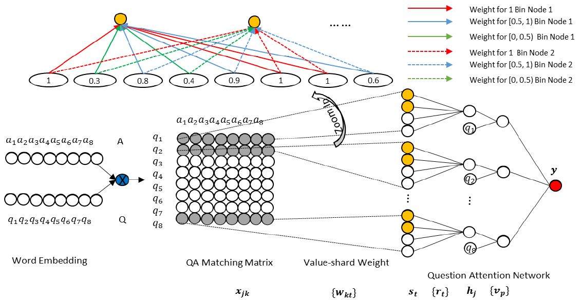 然而,问题与答案之间的语义匹配可能不存在这样的空间规律性,因此,采用相同的值共享权值的方式,来组织网络,如下图所示。其中,匹配矩阵中相似度为1的所有节点共享一个权值,相似度在[0,0.5)之间的节点,共享一个权值,相似度在[0.5,1)之间的节点,共享一个权值。通过这样的方式,可以将计算得到的匹配矩阵转换为相同维度的,并且不管输入矩阵的维度怎么样,隐层节点的个数是固定的。