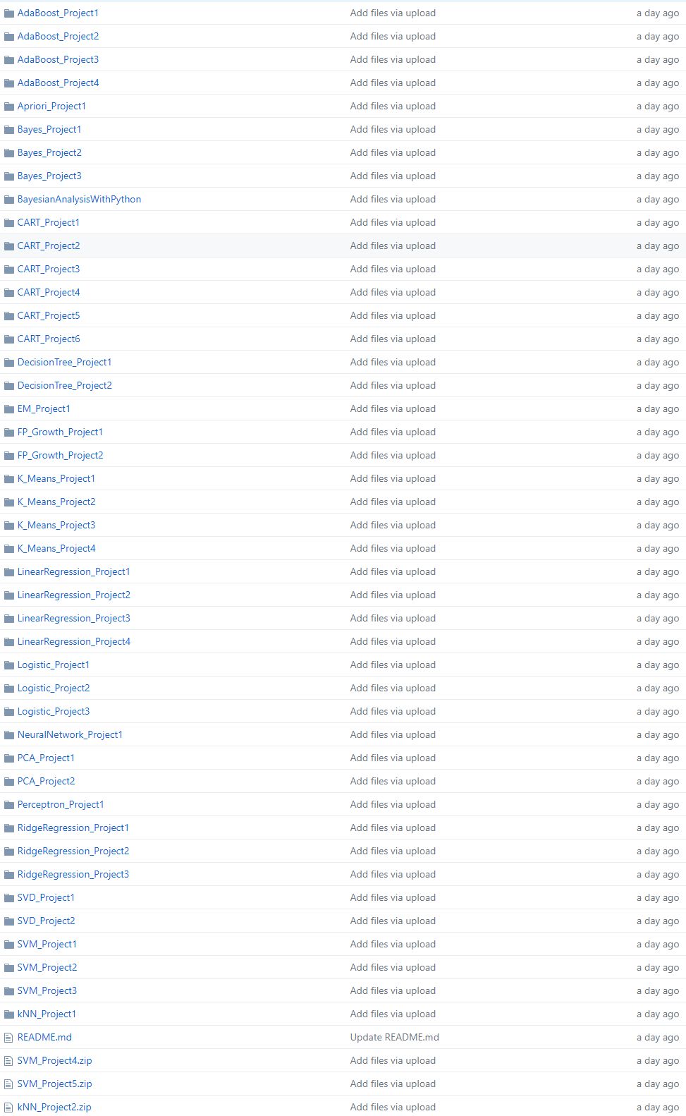 实现的算法包括Adaboost,Apriori、Bayes、CART、决策树、EM、K_means、线性回归、逻辑回归、神经网络、PCA、感知器、岭回归、SVD、SVM、KNN等。