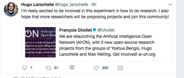 【导读】去年深度学习框架Keras的作者、Google人工智能专家François Chollet 开发了一个专注于AI开源项目协作平台AI·ON(地址:http://ai-on.org)。在该平台目前已经公布10个AI项目的基础上新加入了3个新的开源项目,分别由Yoshua Bengio, Hugo Larochelle 和 Max Welling三位大牛主导,可见这些开源项目的含金量。