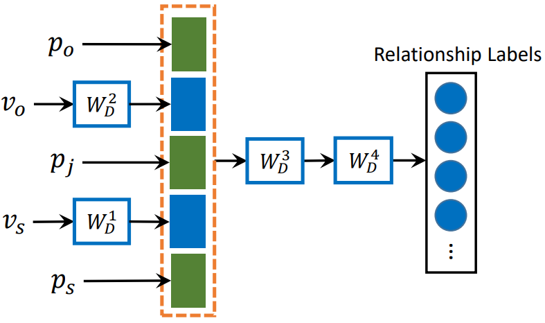 为了避免过拟合,网络设计需要尽可能的小。网络包含4个全连接层,其中po,ps,pj分别是主体、客体的位置编码及二者联合位置编码。vo,vs分别是主体、客体对象的类别词向量。
