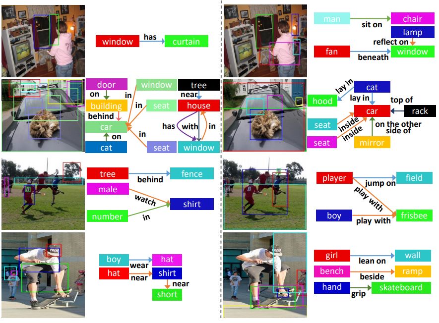 在计算机视觉的研究中,感知任务(如分类、检测、分割等)旨在准确表示单个物体对象信息;认知任务(如看图说话、问答系统等)旨在深入理解整体场景的语义信息。而从单个物体对象到整体场景,视觉关系表征两个物体之间的交互,连接多个物体构成整体场景。关系数据可以作为物体感知任务和语义认知任务之间的桥梁和纽带,具有很高的研究价值。