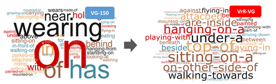 但现有关系数据中,由于大量先验偏置信息的存在,导致关系数据的特征并不能有效的利用在语义理解中。其中,位置关系如"on", "at"等将关系的推理退化为对象检测任务,而单一固定的关系,如"wear","has"等,由于数据中主体客体组合搭配固定,此类关系将关系推理退化为简单演绎推理。因此这些关系数据的大量存在,导致关系特征的学习更多倾向于对单物体感知,而非真正的对场景语义的理解,从而无法使关系数据发挥的作用。同时,这种语义上的、学习上的先验偏置,无法通过常规的基于频率或规则的方法筛选剔除,这导致上述数据端的问题阻碍了关系语义理解上的发展与研究,使得视觉对象关系的研究与语义理解的目标渐行渐远。