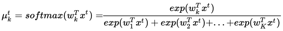 每个类的概率都需要大于0,所以我们可以采用线性映射的指数函数,因为它是在泊松回归中完成的。但是这次有K个不同的概率,它们的总和应该等于1。因此,它需要被归一化,为此我们使用softmax函数。