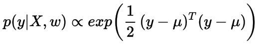 现在,我们的目标是找到使输出y似然最大即p(y|X, w)最大化的w。我们定义p(y|X, w) 服从上面的正态分布,其似然函数如下所示: