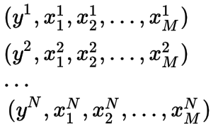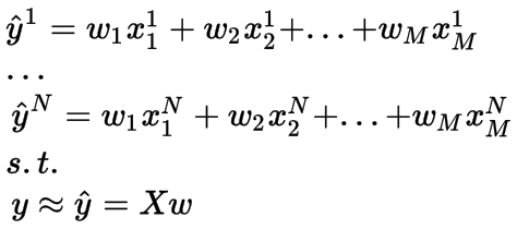 我们定义一个M维向量w来表示将输入映射到输出的权重。我们用N*M维矩阵 X来表示所有的输入。 y被定义为N维输出向量。