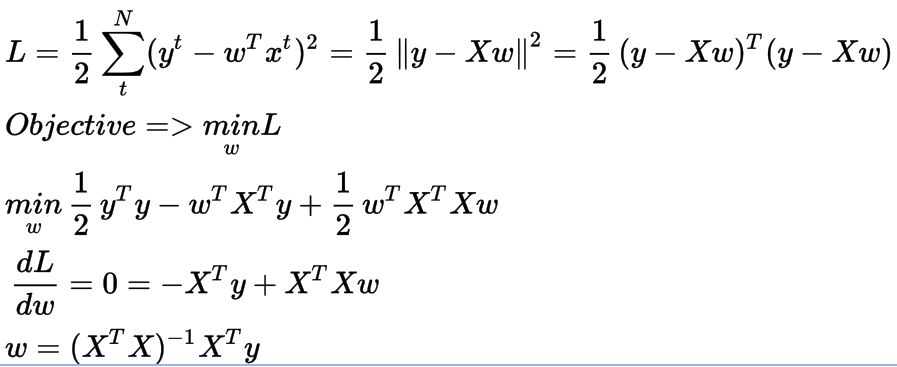 我们的目标是找到最好的参数w使真实输出向量y和近似值X*w之间的欧式距离最小。为此,我们通常使用最小二乘误差和矩阵运算来最小化它。这里我们用L表示损失(误差)函数。