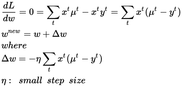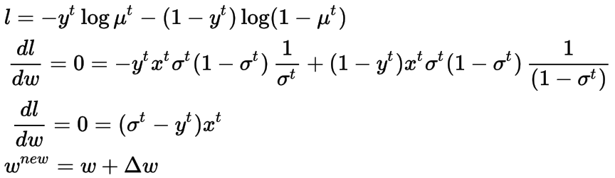 我们对损失函数求关于权重w的导数,并将其设为0。就我所知,与线性回归相反,它没有闭合形式解。但是我们可以使用无约束的优化方法来找到迭代的解决方案,下面我为它提供了梯度下降法。在梯度下降法中,我们逐渐更新权重,并在损失梯度的负方向上来进行优化(因为这是损失相对于权重w减小的方向)。