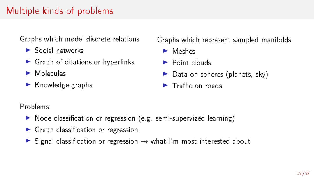 深度学习比如CNN已经在计算机视觉(CV)以及自然语言处理等领域取得了state-of-art 的水平,其中的数据可以被称作是一种Euclidean Data,CNN正好能够高效的处理这种数据结构,探索出其中所存在的特征表示。但是现实的处理问题当中还存在大量的 Non-Euclidean Data,如社交多媒体网络(Social Network)数据,化学成分(Chemical Compound)结构数据,生物基因蛋白(Protein)数据以及知识图谱(Knowledge Graphs)数据等等,这类的数据属于图结构的数据(Graph-structured Data)。CNN等神经网络结构则并不能有效的处理这样的数据。如何讲CNN的思想应用在graph数据上成为最近研究的一个热点。