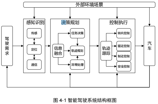 智能驾驶的关键技术是环境感知技术和车辆控制技术,其中环境感知技术是无人驾驶汽车行驶的基础,车辆控制技术是无人驾驶汽车行驶的核心,包括轨迹规划和控制执行两个环节,这两项技术相辅相成共同构成智能驾驶汽车的关键技术,其系统组成如图 4-1 所示。智能驾驶的整个流程归结起来有三个部分,首先,是通过雷达、像机、车载网联系统等对外界的环境进行感知识别;然后,在传感感知融合信息基础上,通过智能算法学习外界场景信息,规划车辆运行轨迹,实现车辆拟人化控制融入交通流中;其次,跟踪决策规划的轨迹目标,控制车辆的油门、刹车和转向等驾驶动作,调节车辆行驶速度、位置和方向等状态,以保证汽车的安全性、操纵性和稳定性。如果能够默契地进行,那么整个智能驾驶流程就算完成了。因此研究自动驾驶的控制技术变得具有十分重要的意义。
