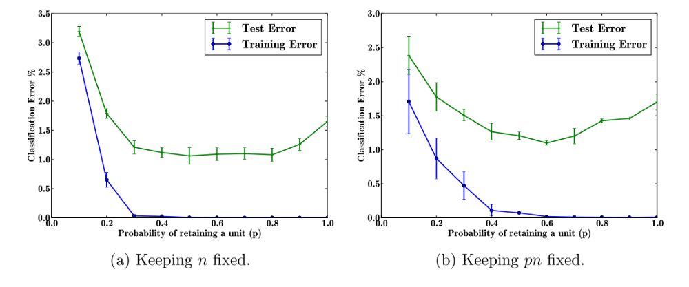 图2. (a) 隐藏单元数(n)固定时的误差 (2)dropout后隐藏单元数固定。