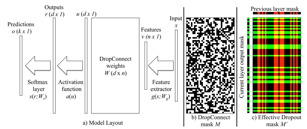 图3. (a)单个DropConnect层的示例模型布局。 在输入x上运行特征提取器g()之后,随机实例化掩码M(例如(b)。掩蔽的权重与该特征向量相乘以产生u,其是 激活函数a和softmax层s的输入。 为了进行比较,c)显示了Dropout在应用于前一层的输出(列)和该层的输出(行)时使用的元素的有效权重掩码。