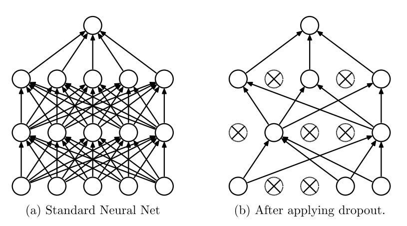 图1. a)标准神经网络,没有dropout。 b)应用了dropout的神经网络。