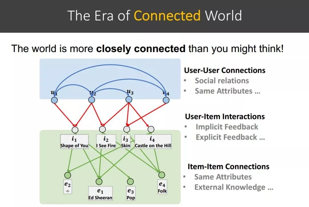 推荐系统方法构造预测模型来估计用户-项交互的可能性。以前的模型大多遵循一种普遍的监督学习模式--将每个交互看作一个单独的数据实例,并根据“信息孤岛”进行预测。然而,这些方法忽略了数据实例之间的关系,这可能导致性能不佳,特别是在数据稀疏的情况下。此外,建立在单独数据实例上的模型很难展示推荐背后的原因,这使得推荐过程难以理解。