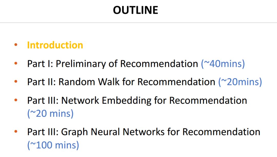 在本教程中,我们将从图学习的角度重新讨论推荐问题。常用的推荐数据源可以组织成图,如用户-项目交互(二部图)、社交网络、项目知识图(异构图)等。这样一个基于图的组织将孤立的数据实例连接起来,从而为利用高阶连接带来好处,这些连接为协同过滤、基于内容的过滤、社会影响建模和知识感知推理编码了有意义的模式。随着最近图神经网络(GNNs)的成功,基于图的模型显示出其作为下一代推荐系统的技术潜力。本教程提供了基于图学习的回顾。