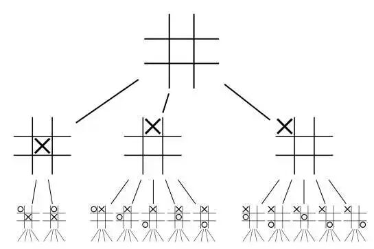 Game tree 从上而下,第 k 层(最上面的树根计为0层)代表下了 k 步后的游戏局面(即状态)。而边代表不同的走法,同一层的边是同一个玩家的走法,并且不同层间两个玩家交替下棋。