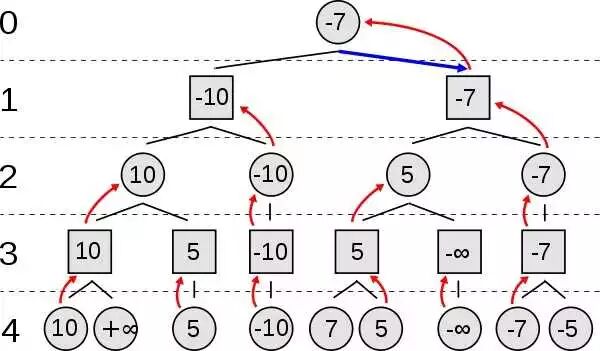 然后我们使用回溯的思想,反向推导。假如到了第3层,这是对手走棋,对手会怎么走?对手一定会走使得最后结果最小的那步对吧?于是在第3层,我们可以填上下一层相连节点中的最小值(所谓MIN);同理,在第二层,我们会选择最大的值,因为自己总是希望更好(所谓MAX)。于是两方反复形成了MIN-MAX的“对抗”,一直到树的根节点。这个时候你发现结果是-7,这意味着,如果对手一旦做了同样的推理,你是必输的;而你最好的可以取得的结果就是使得结果的评分为-7。