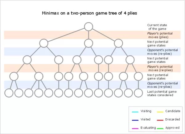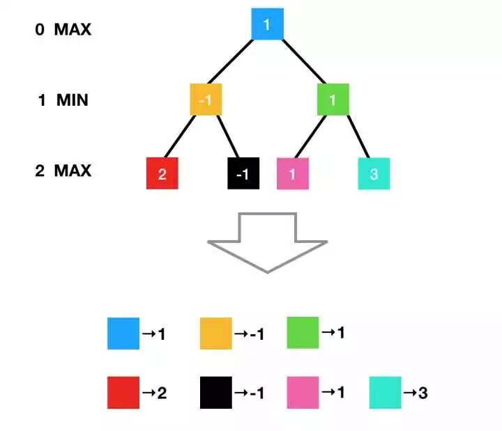 由于其MIN-MAX的特性,对应算法也叫做 Minimax (Min-i-max)。实际中为了效率算法的运行是遵循“深度优先”的原则的,具体见下图(非常慢的GIF)
