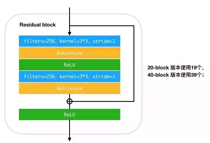 此外还需要注意的是,”主体部分“是由一些称为 Residual Block(残差块)的部分组成的,这是由于特别深的神经网络难以优化,一个解决技巧是引入”残差“,形成残差结构。Residual 几乎是深层 CNN 的标配结构之一。AlphaGo 里面使用的 Residual Block 的结构是:
