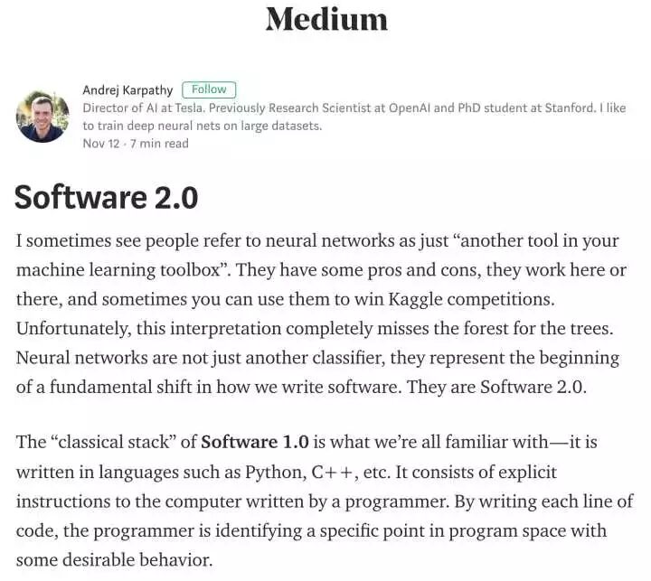 同时,神经网络得到任何局面的估值都是常数时间,这和搜索树是非常不同的。这让我想到了李飞飞的得意门生,现任特斯拉人工智能规划师 Andrej Karpathy 在 Medium 上发的“软件 2.0”这篇blog。