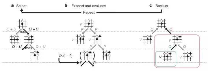 那么最后一个问题:Q是价值的平均,那么这些“价值”怎么来?——很简单,搜索到一定深度时直接用估值函数得到一个价值V即可, 然后使用V更新上面所有节点的Q值,同时 N增加1。