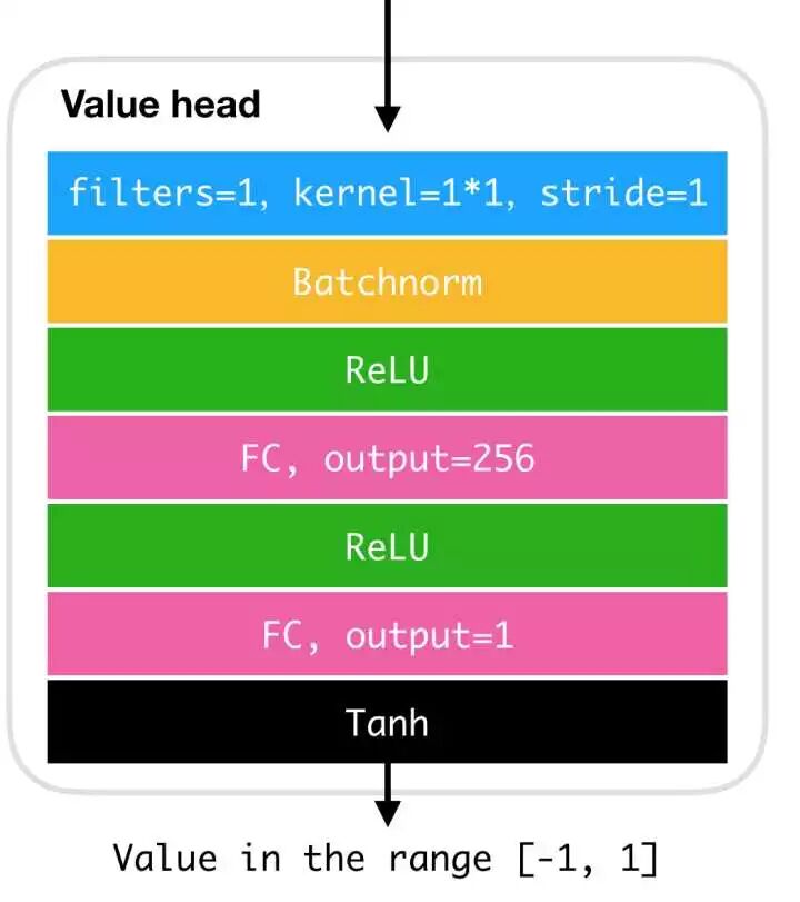 除了网络主体外,我们说过还需要一个“头”用来将中间特征转化为值,对于估值而言,这个“头“长这样(以AlphaGo-Zero为例):