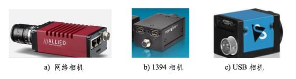 除了以上两种常见的分类方法,工业相机还可以按照传感器的结 构特性分为线阵相机和面阵相机;按照输出图像的色彩分为黑白相机 和彩色相机;按照响应频率范围分为普通相机、红外相机和紫外相机; 按照扫描方式分为逐行扫描相机和隔行扫描相机等;按照接口类型分 为网络相机、1394 相机和 USB 相机,如图 2-2 所示。