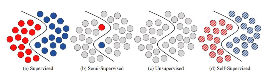 自监督使用一个借托pretext任务来学习未标记数据的表示。借托pretext任务是无监督的,但学习表征往往不能直接用于图像分类,必须进行微调。因此,自监督学习可以被解释为一种无监督的、半监督的或其自身的一种策略。我们将自我监督学习视为一种特殊的学习策略。在下面,我们将解释我们是如何得出这个结论的。如果在微调期间需要使用任何标签,则不能将该策略称为无监督的。这与半监督方法也有明显的区别。标签不能与未标记的数据同时使用,因为借托pretext任务是无监督的,只有微调才使用标签。对我们来说,将标记数据的使用分离成两个不同的子任务本身就是一种策略的特征。