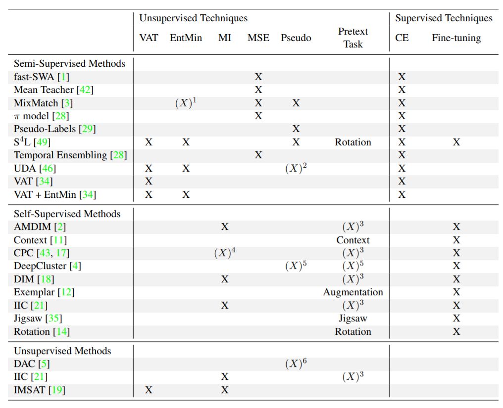 ——在左侧,第3节中回顾的方法按学习策略排序。第一行列出了在2.2小节中讨论过的可能的技术。根据是否可以使用带标签的数据,将这些技术分为无监督技术和有监督技术。技术的缩写也在第2.2小节中给出。交叉熵(Cross-entropy, CE)将CE的使用描述为训练损失的一部分。微调(FT)描述了交叉熵在初始训练后(例如在一个借口任务中)对新标签的使用。(X)指该技术不是直接使用,而是间接使用。个别的解释由所指示的数字给出。1 - MixMatch通过锐化预测[3],隐式地实现了熵最小化。2 - UDA预测用于过滤无监督数据的伪标签。3 -尽量减少相互信息的目的作为借口任务,例如视图之间的[2]或层之间的[17]。4 -信息的丢失使相互信息间接[43]最大化。5 - Deep Cluster使用K-Means计算伪标签,以优化分配为借口任务。6 - DAC使用元素之间的余弦距离来估计相似和不相似的项。可以说DAC为相似性问题创建了伪标签。