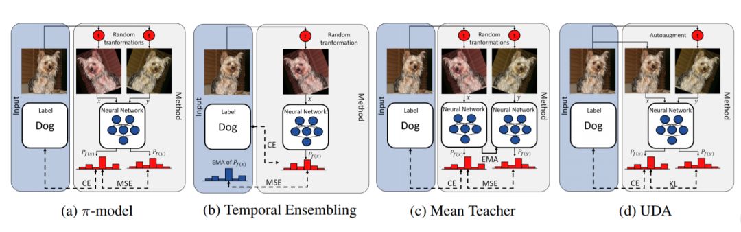 四种选择的半监督方法的图解——使用的方法在每张图像下面给出。输入在左边的蓝色方框中给出。在右侧提供了该方法的说明。一般来说,这个过程是自上而下组织的。首先,输入图像经过无或两个不同的随机变换预处理。自动增广[9]是一种特殊的增广技术。下面的神经网络使用这些预处理图像(x, y)作为输入。损失的计算(虚线)对于每种方法都是不同的,但是共享公共部分。所有的方法都使用了标记和预测分布之间的交叉熵(CE)。所有的方法还使用了不同预测输出分布(Pf(x), Pf(y))之间的一致性正则化。