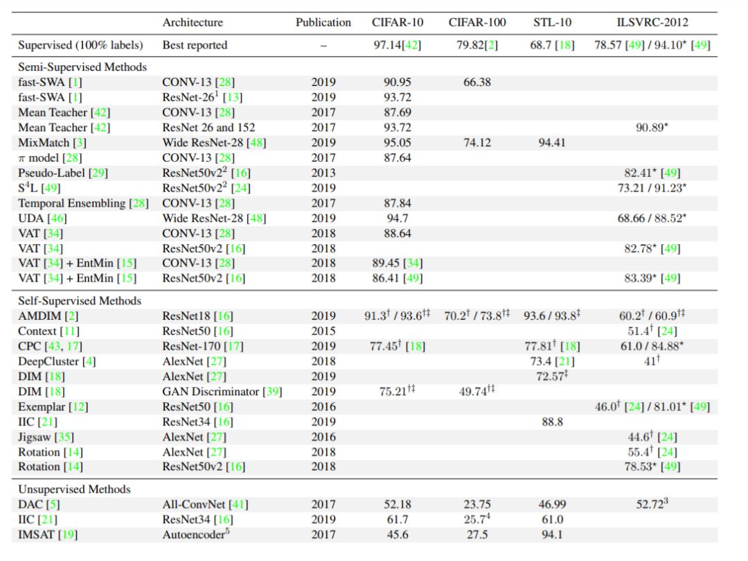 报告准确度的概述——第一列说明使用的方法。对于监督基线,我们使用了最好的报告结果,作为其他方法的基线。原始论文在准确度后的括号内。第二列给出了体系结构及其参考。第三列是预印本的出版年份或发行年份。最后四列报告了各自数据集的最高准确度分数%。