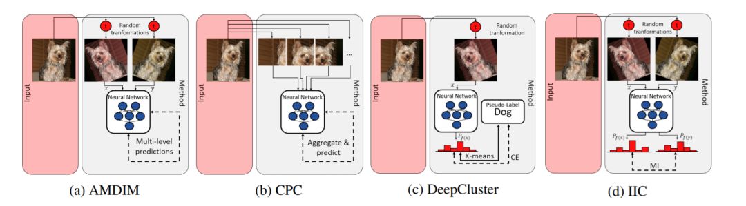四种选择的自我监督方法的图解——使用的方法在每张图像下面给出。输入在左边的红色方框中给出。在右侧提供了该方法的说明。微调部分不包括在内。一般来说,这个过程是自上而下组织的。首先,对输入图像进行一两次随机变换预处理或分割。下面的神经网络使用这些预处理图像(x, y)作为输入。损失的计算(虚线)对于每种方法都是不同的。AMDIM和CPC使用网络的内部元素来计算损失。DeepCluster和IIC使用预测的输出分布(Pf(x)、Pf(y))来计算损耗