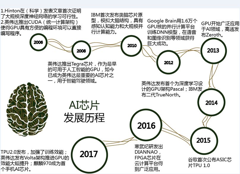 (1)2007年以前,AI芯片产业一直没有发展成为成熟的产业;同时由于当时算法、数据量等因素,这个阶段AI芯片并没有特别强烈的市场需求,通用的CPU芯片即可满足应用需要。