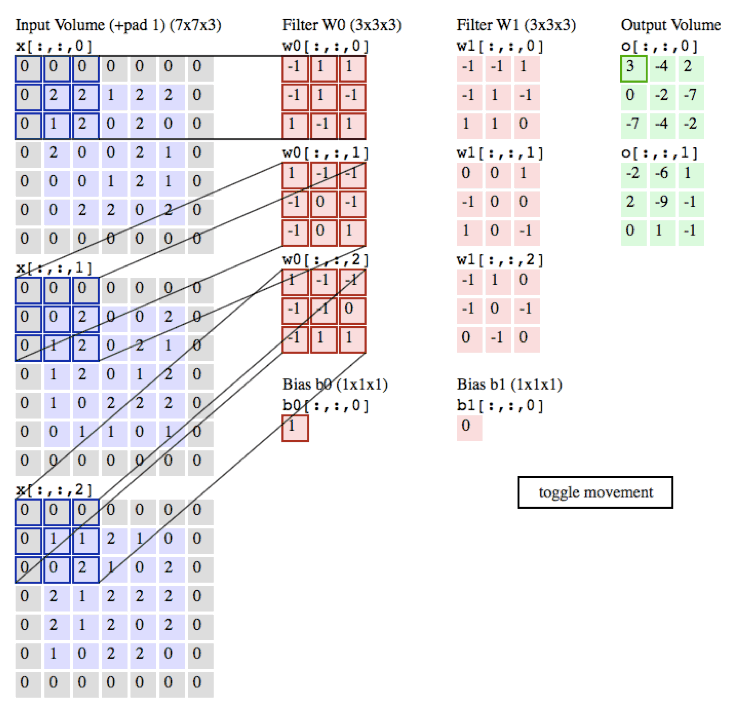卷积层演示:下面是一个卷积层的运行演示。因为3D数据难以可视化,所以所有的数据(输入数据是蓝色,权重数据是红色,输出数据是绿色)都采取将深度切片按照列的方式排列展现。输入数据的尺寸是W_1=5,H_1=5,D_1=3,卷积层参数K=2,F=3,S=2,P=1。就是说,有2个滤波器,滤波器的尺寸是3* 3,它们的步长是2.因此,输出数据体的空间尺寸是(5-3+2)/2+1=3。注意输入数据体使用了零填充P=1,所以输入数据体外边缘一圈都是0。下面的例子在绿色的输出激活数据上循环演示,展示了其中每个元素都是先通过蓝色的输入数据和红色的滤波器逐元素相乘,然后求其总和,最后加上偏差得来。