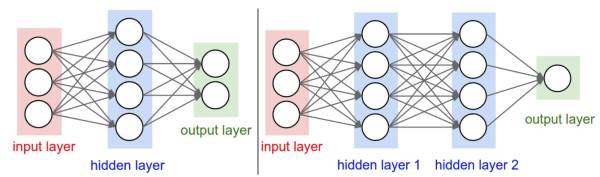 左边是一个2层神经网络,隐层由4个神经元(也可称为单元(unit))组成,输出层由2个神经元组成,输入层是3个神经元。右边是一个3层神经网络,两个含4个神经元的隐层。