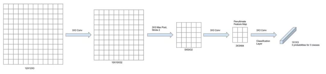 下面的图6显示了最初通过3个卷积层的尺寸为12X12的图像,每个卷积层具有3×3的滤波器尺寸(具有不同的步长和最大池化操作)。注意,在经过3个卷积层之后,我们得到一个大小为3×3×64的特征图,这个特征图被称为倒数第二个特征图,即应用在分类层之前的特征图。我们之所以这样命名,是因为我们会在后续内容中反复提及。在这个3X3特征图的基础上,我们应用了一个卷积核尺寸为3X3的卷积层。在这里使用三组这样的3X3滤波器来获得在网络末端输出的3个1X1的特征映射,其对应于三种类别的概率。
