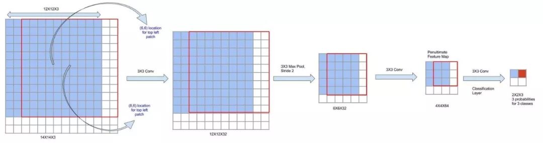 正如你所看到的,不同的12X12块在倒数第二个特征图中会有不同的3X3表示,最后在输出层产生相应的分数。
