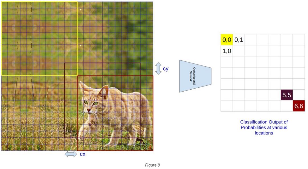 卷积层在计算上是非常昂贵的,并且计算每个块将花费很长时间。但是,使用这个方案,我们可以避免重复计算不同块之间的公共部分。这里我们对整个图像的特征图只进行一次计算。然后,由于我们知道倒数第二个特征图上的不同部分映射到图像的不同区域,我们可以直接在其上进行分类(分类层)。这就像在卷积特征图上执行滑动窗口,而不是在输入图像上执行滑动窗口。所以这节省了大量的计算。