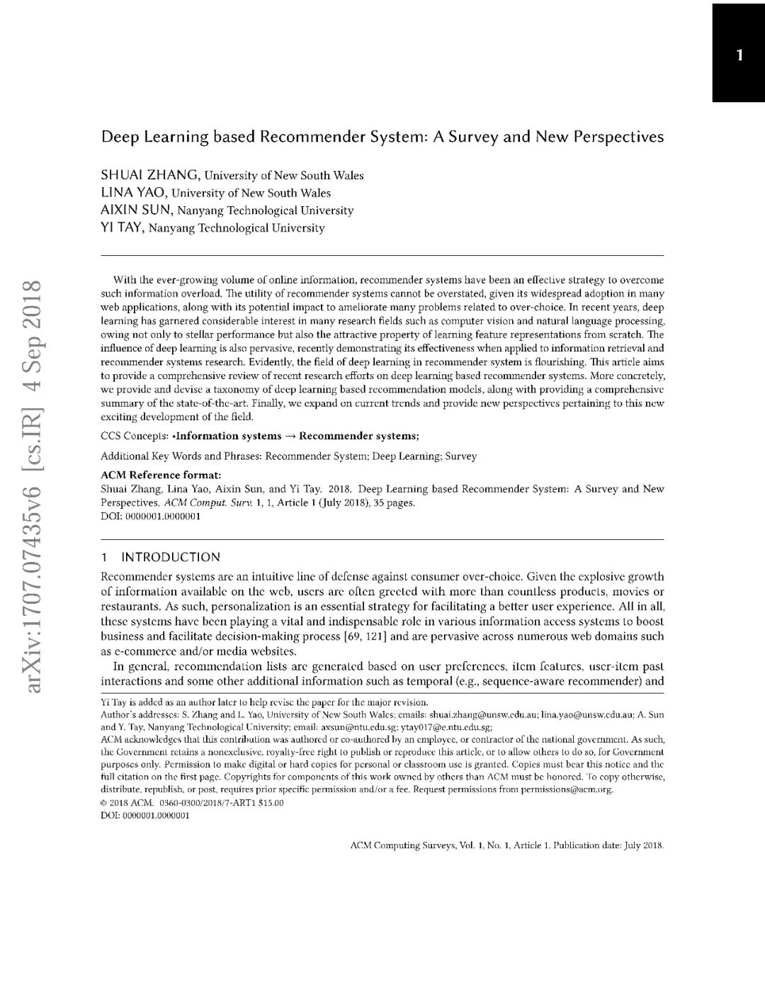 【导读】随着在线信息量的不断增长,推荐系统已成为克服此类信息过载的有效策略。鉴于其在许多网络应用中的广泛采用,以及其改善与过度选择相关的许多问题的潜在影响,推荐系统的实用性不容小觑。近年来,深度学习在计算机视觉和自然语言处理等许多研究领域引起了相当大的兴趣,不仅归功于出色的表现,而且还具有从头开始学习特征表征的吸引人的特性。深度学习的影响也很普遍,最近证明了它在应用于信息检索和推荐系统研究时的有效性。显然,推荐系统中的深度学习领域正在蓬勃发展。本文旨在全面回顾最近基于深度学习的推荐系统的研究工作。更具体地说,我们提供并设计了基于深度学习的推荐模型的分类,并提供了最新技术的综合摘要。最后,我们扩展了当前的趋势,并提供了有关该领域新的令人兴奋的发展的新观点。