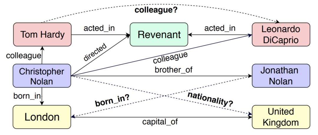 由于知识图谱本身就是一种图数据,因此知识图谱 +GNN 的组合自然就成了解决各类知识图谱问题的新手段。关系补全或预测问题是知识图谱的一大基础任务,通过关系的推理补全可以大大提升知识图谱的应用质量,下图给出了关系补全的一个实例: