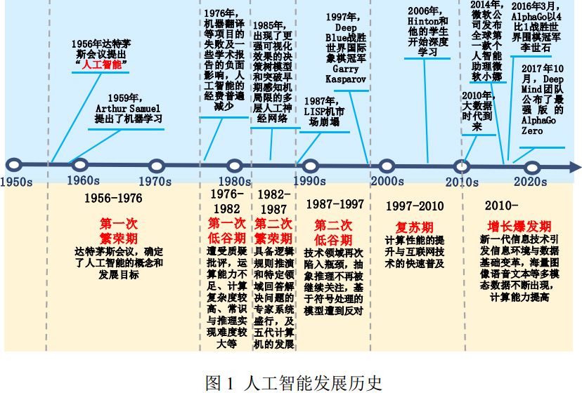 人工智能始于 20 世纪 50 年代,至今大致分为三个发展阶段:第一阶段(20 世纪 50 年代——80 年代)。这一阶段人工智能刚诞生,基于抽象数学推理的可 编程数字计算机已经出现,符号主义(Symbolism)快速发展,但由于很多事物 不能形式化表达,建立的模型存在一定的局限性。此外,随着计算任务的复杂性 不断加大,人工智能发展一度遇到瓶颈;第二阶段(20 世纪 80 年代——90 年代 末)。在这一阶段,专家系统得到快速发展,数学模型有重大突破,但由于专家 系统在知识获取、推理能力等方面的不足,以及开发成本高等原因,人工智能的 发展又一次进入低谷期;第三阶段(21 世纪初——至今)。随着大数据的积聚、 理论算法的革新、计算能力的提升,人工智能在很多应用领域取得了突破性进展, 迎来了又一个繁荣时期。人工智能具体的发展历程如图 1 所示。