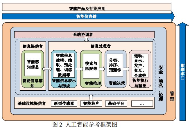 人工智能参考框架提供了基于“角色—活动—功能”的层级分类体系,从 “智能信息链”(水平轴)和“IT 价值链”(垂直轴)两个维度阐述了人工智 能系统框架。“智能信息链”反映从智能信息感知、智能信息表示与形成、智能 推理、智能决策、智能执行与输出的一般过程。在这个过程中,智能信息是流动 的载体,经历了“数据—信息—知识—智慧”的凝练过程。“IT 价值链”从人 工智能的底层基础设施、信息(提供和处理技术实现)到系统的产业生态过程, 反映人工智能为信息技术产业带来的价值。此外,人工智能系统还有其它非常重 要的框架构件:安全、隐私、伦理和管理。人工智能系统主要由基础设施提供者、 信息提供者、信息处理者和系统协调者 4 个角色组成。
