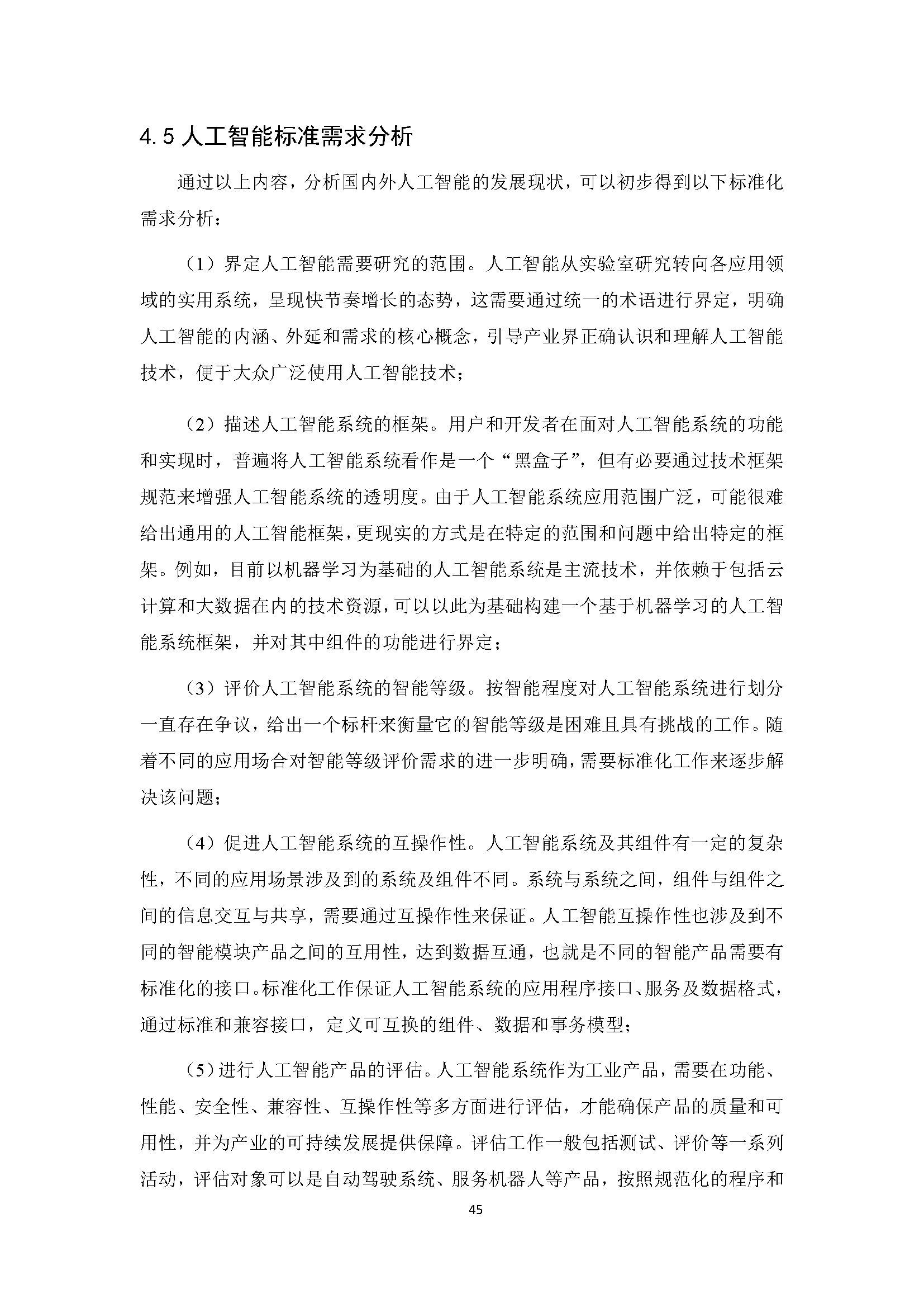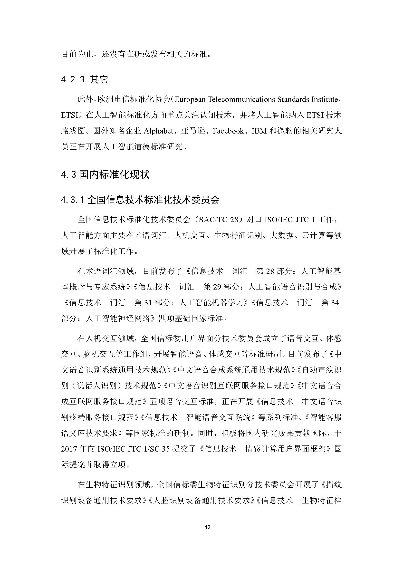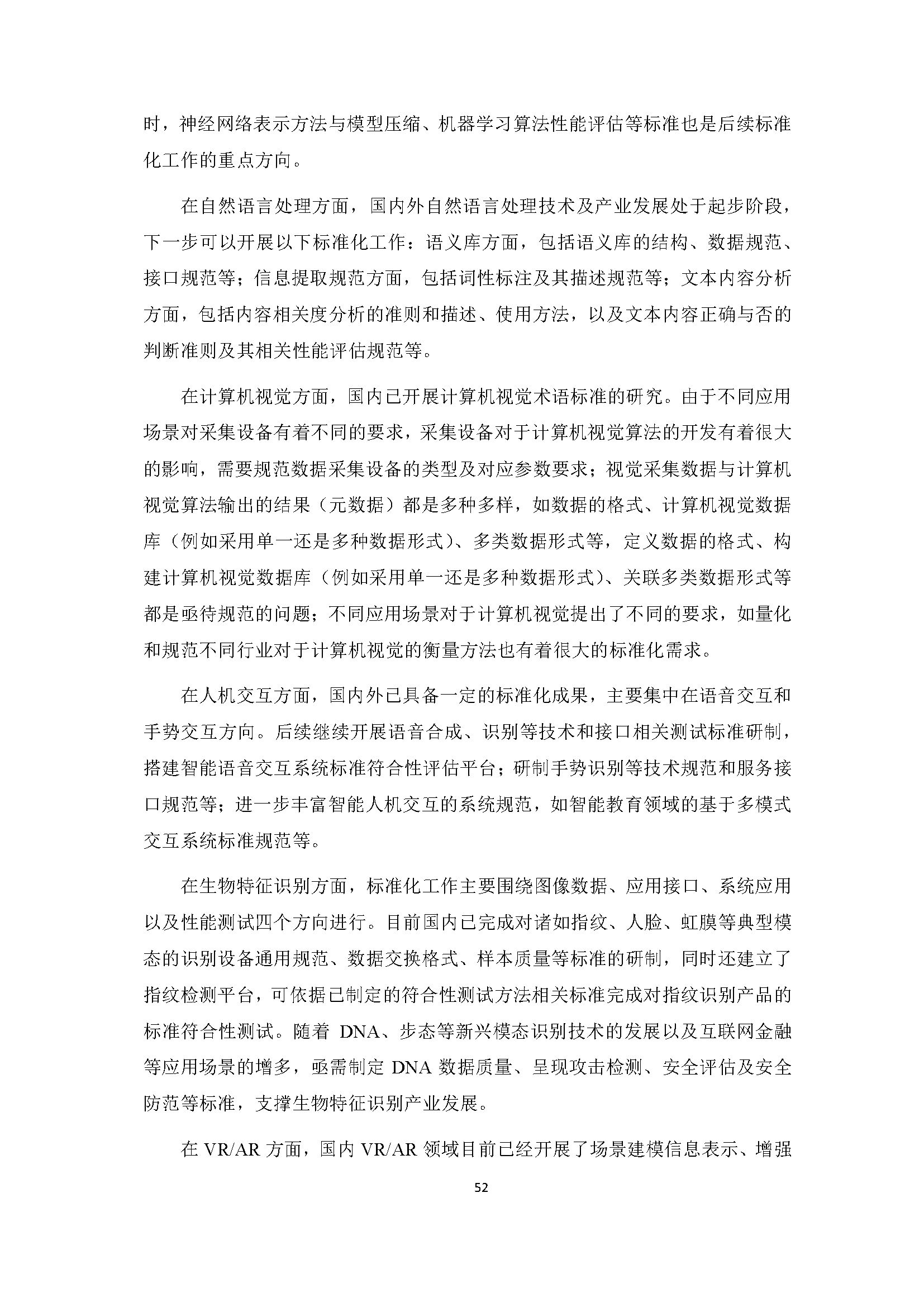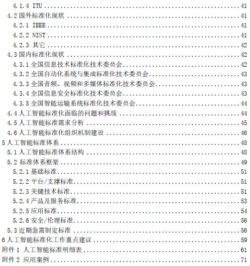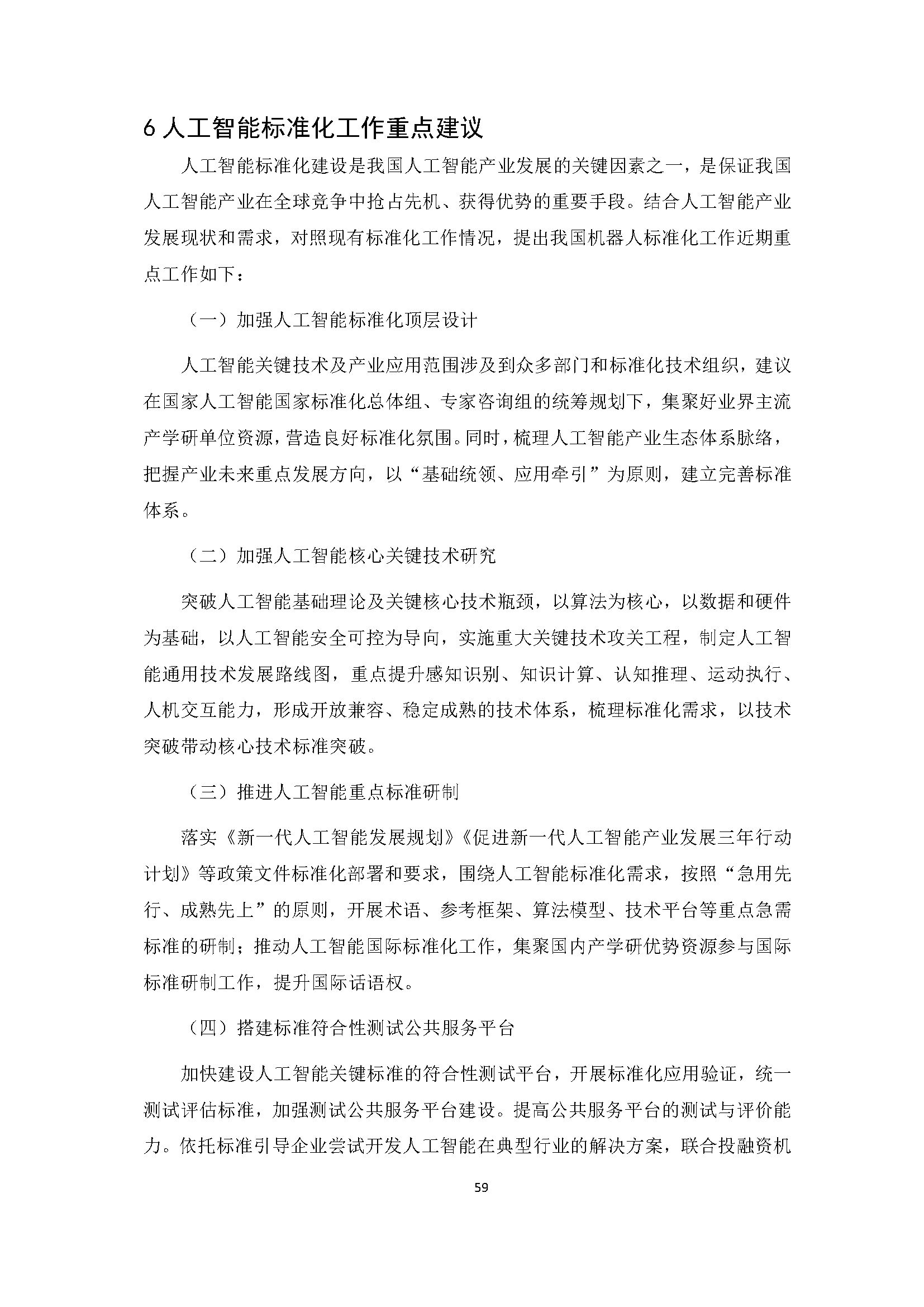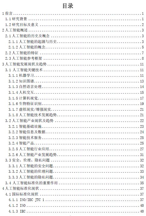 本白皮书并不预期成为人工智能领域的全面技术和产业综述,不求面面俱到, 仅针对目前人工智能领域涵盖的技术热点和产业情况进行分析,研究提出人工智 能标准体系。人工智能标准化工作尚处于起步阶段,本白皮书只作为人工智能领 域技术、产业和标准化之间初始的连接纽带,并将在今后不断根据技术、产业和 标准化的发展需求进行修订。本白皮书不过多地给出人工智能领域观点性的陈述, 力求以较为浅显易懂的语言和方式进行阐述。