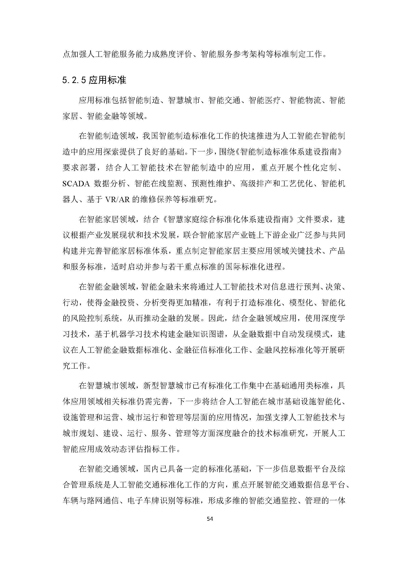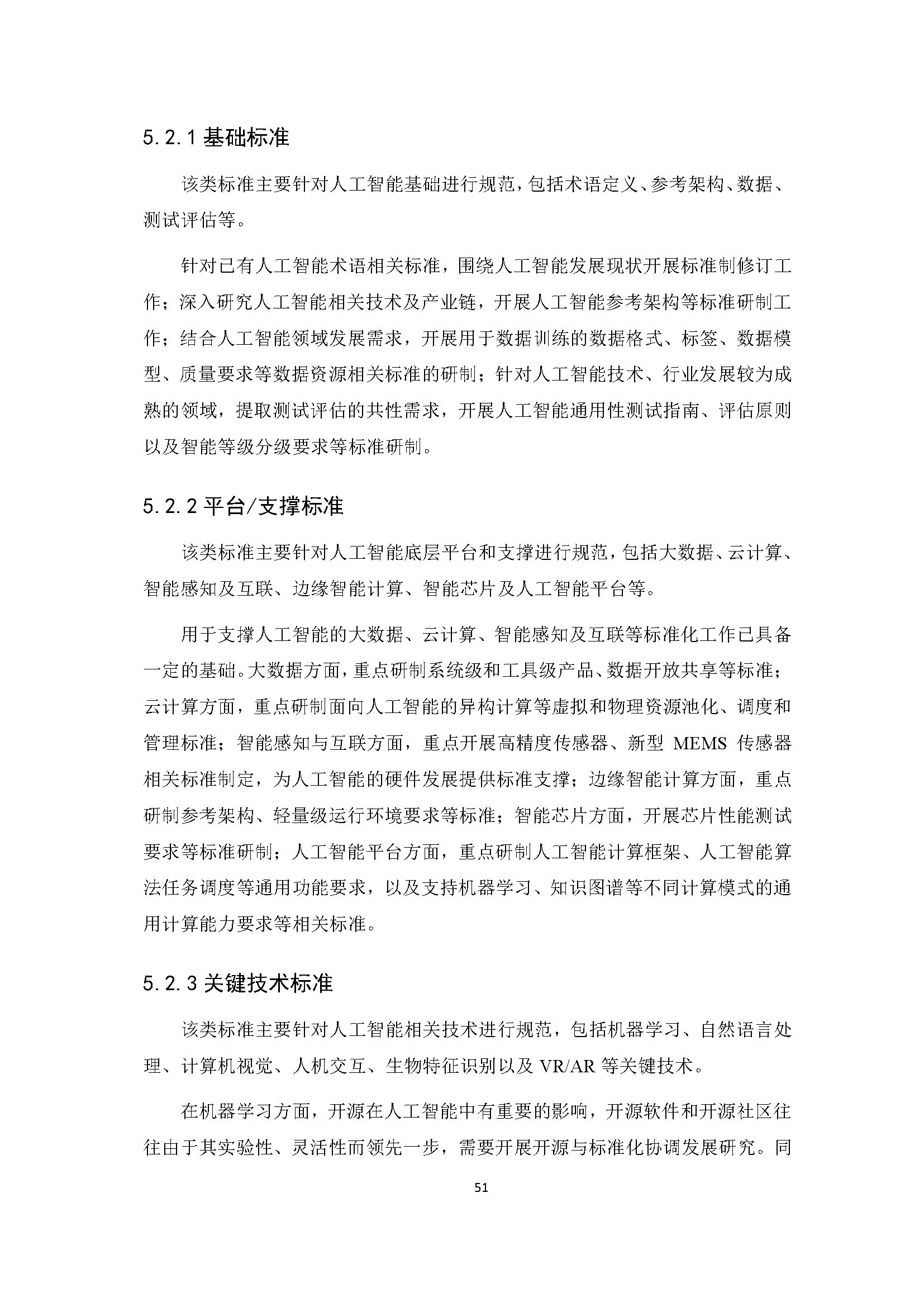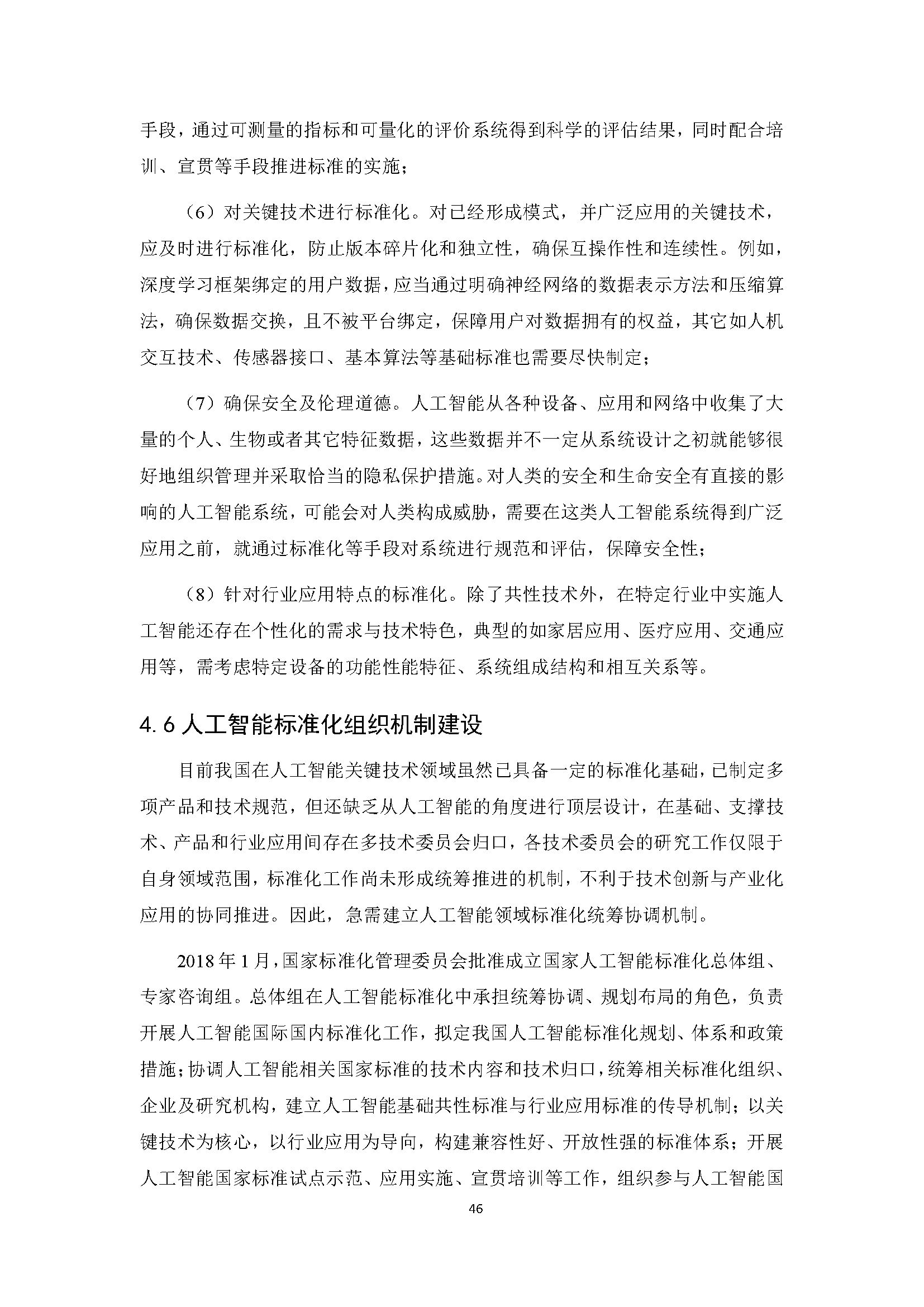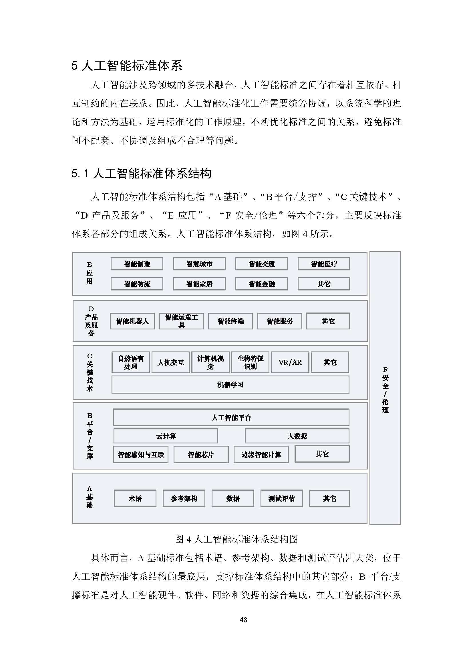 标准化工作对人工智能及其产业发展具有基础性、支撑性、引领性的作用, 既是推动产业创新发展的关键抓手,也是产业竞争的制高点。当前,在我国人工 智能相关产品和服务不断丰富的同时,也出现了标准化程度不足的问题。人工智 能涉及众多领域,虽然某些领域已具备一定的标准化基础,但是这些分散的标准 化工作并不足以完全支撑整个人工智能领域。另一方面,人工智能属于新兴领域, 发展方兴未艾,从世界范围来看,标准化工作仍在起步过程中,尚未形成完善的 标准体系,我国基本与国外处于同一起跑线,存在快速突破的机会窗口。只要瞄 准机会,快速布局,完全有可能抢占标准创新的制高点,反之,则有可能丧失良 机。因此,迫切需要把握机遇,加快对人工智能技术及产业发展的研究,系统梳 理、加快研制人工智能各领域的标准体系,明确标准之间的依存性与制约关系, 建立统一完善的标准体系,以标准的手段促进我国人工智能技术、产业蓬勃发展。