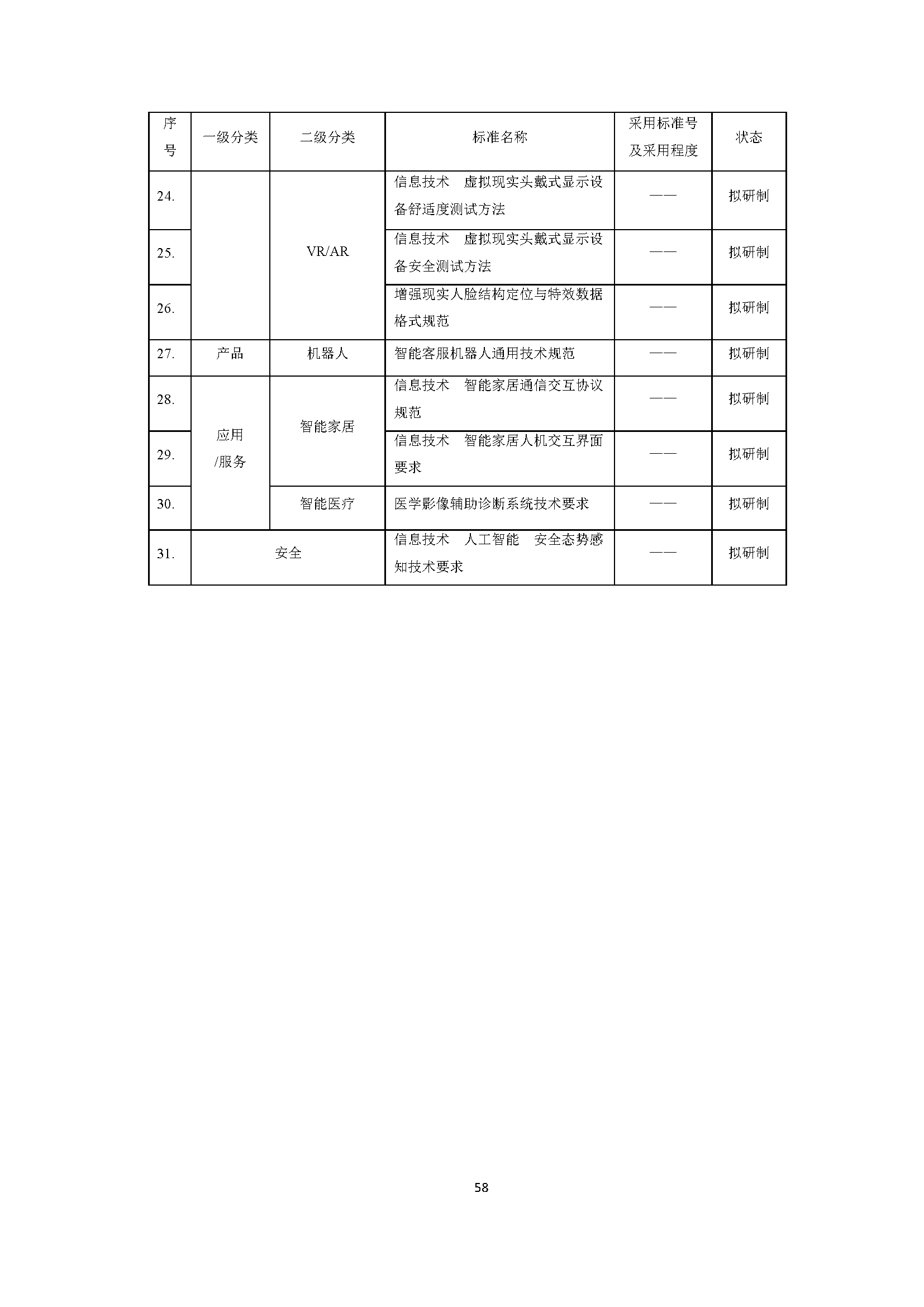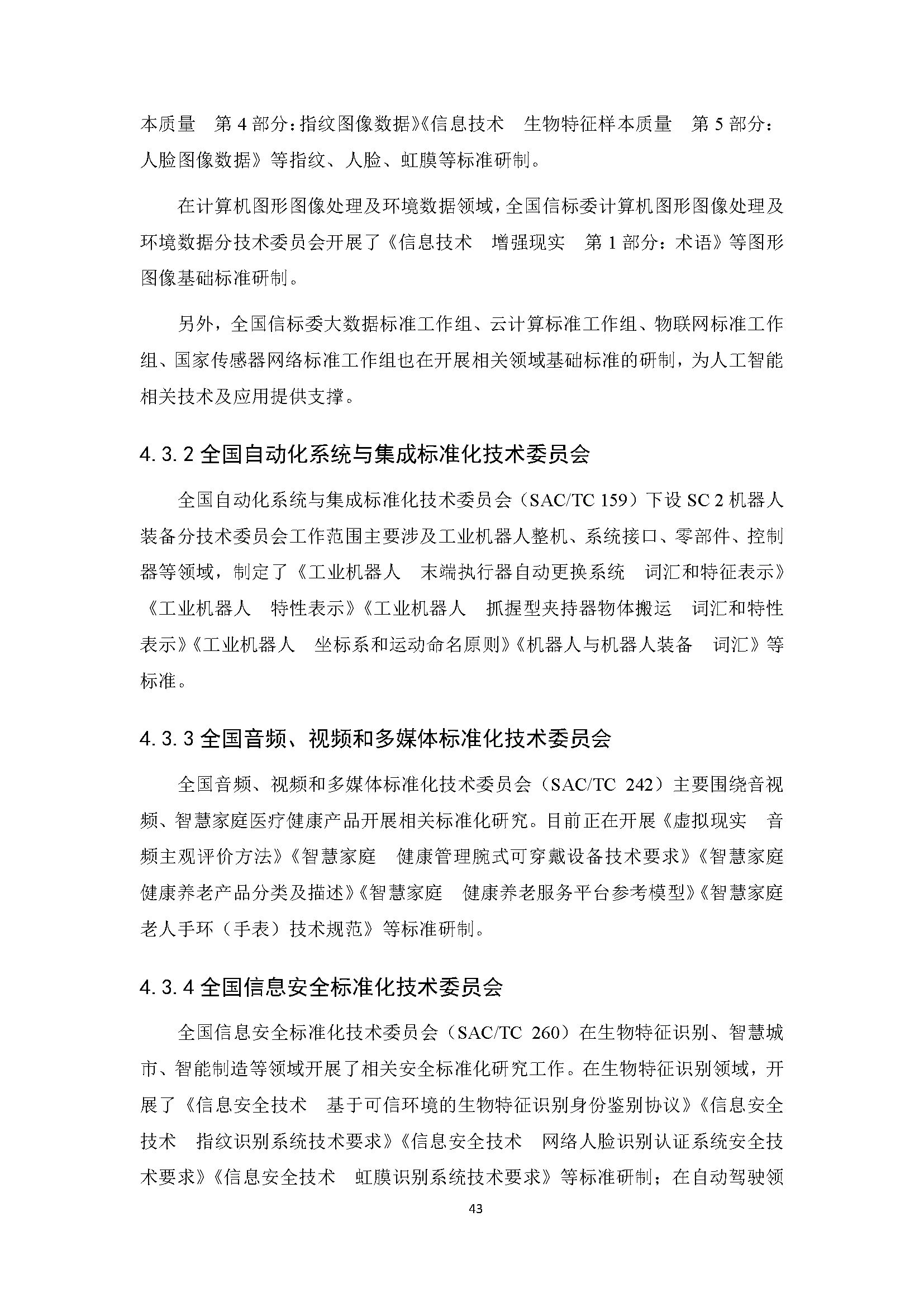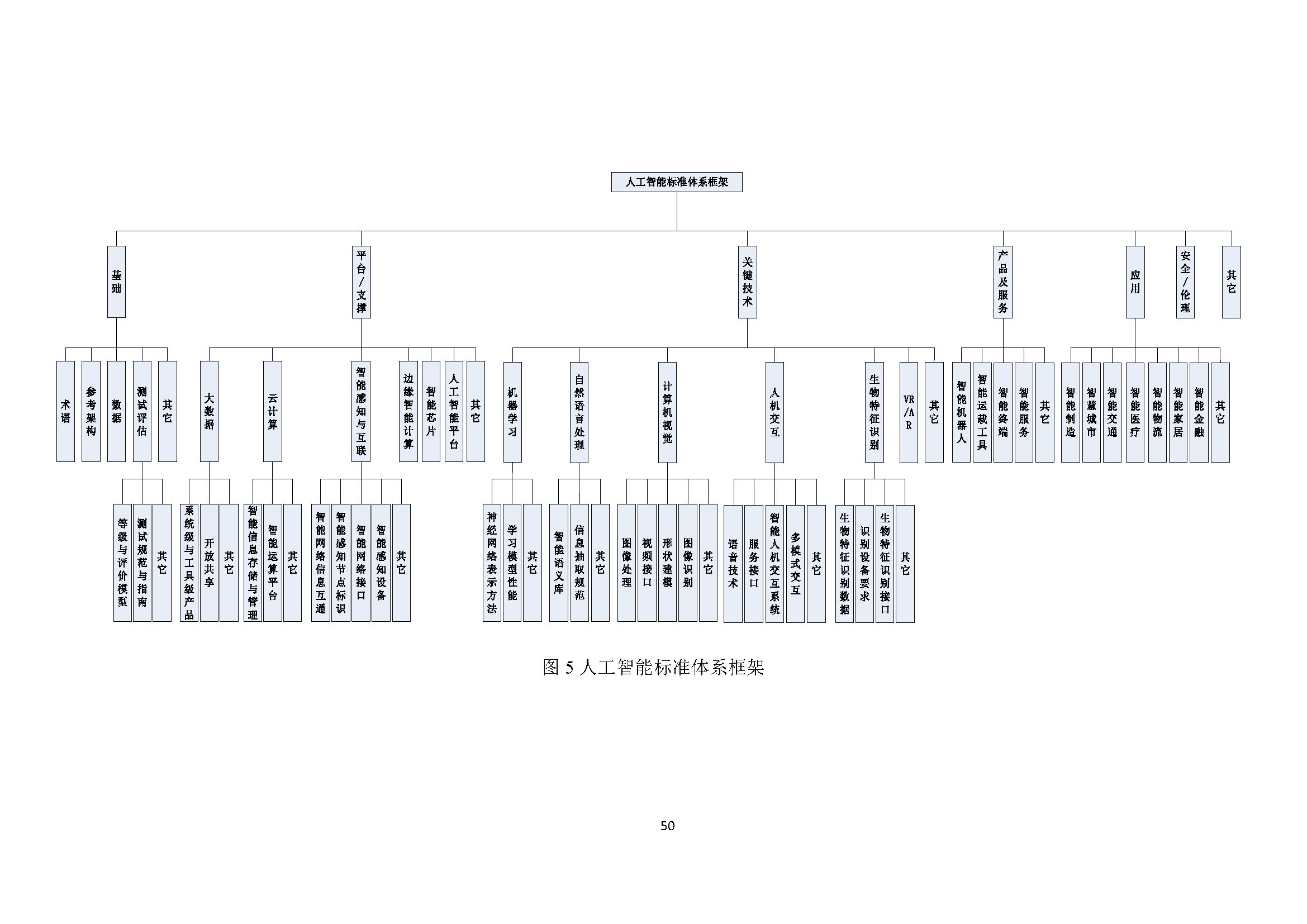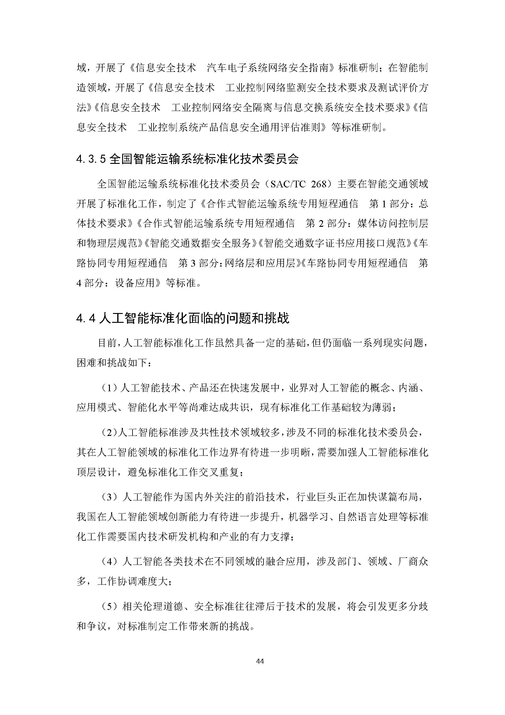 标准化工作对人工智能及其产业发展具有基础性、支撑性、引领性的作用, 既是推动产业创新发展的关键抓手,也是产业竞争的制高点。当前,在我国人工 智能相关产品和服务不断丰富的同时,也出现了标准化程度不足的问题。人工智 能涉及众多领域,虽然某些领域已具备一定的标准化基础,但是这些分散的标准 化工作并不足以完全支撑整个人工智能领域。另一方面,人工智能属于新兴领域, 发展方兴未艾,从世界范围来看,标准化工作仍在起步过程中,尚未形成完善的 标准体系,我国基本与国外处于同一起跑线,存在快速突破的机会窗口。只要瞄 准机会,快速布局,完全有可能抢占标准创新的制高点,反之,则有可能丧失良 机。因此,迫切需要把握机遇,加快对人工智能技术及产业发展的研究,系统梳 理、加快研制人工智能各领域的标准体系,明确标准之间的依存性与制约关系, 建立统一完善的标准体系,以标准的手段促进我国人工智能技术、产业蓬勃发展。