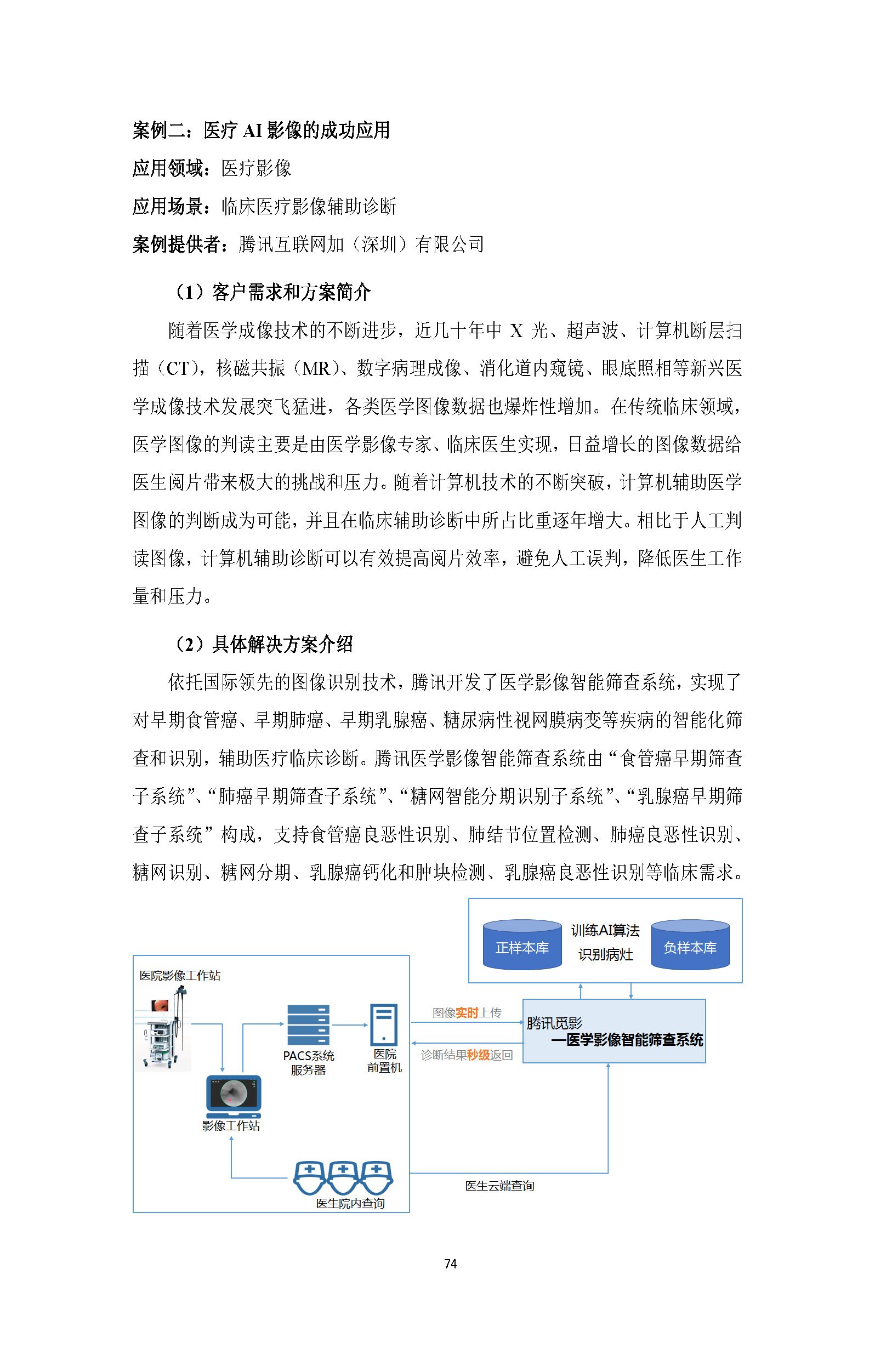 在医疗影像辅助诊断方面,影像判读系统的发展是人工智能技术的产物。早 期的影像判读系统主要靠人手工编写判定规则,存在耗时长、临床应用难度大等 问题,从而未能得到广泛推广。影像组学是通过医学影像对特征进行提取和分析, 为患者预前和预后的诊断和治疗提供评估方法和精准诊疗决策。这在很大程度上 简化了人工智能技术的应用流程,节约了人力成本。