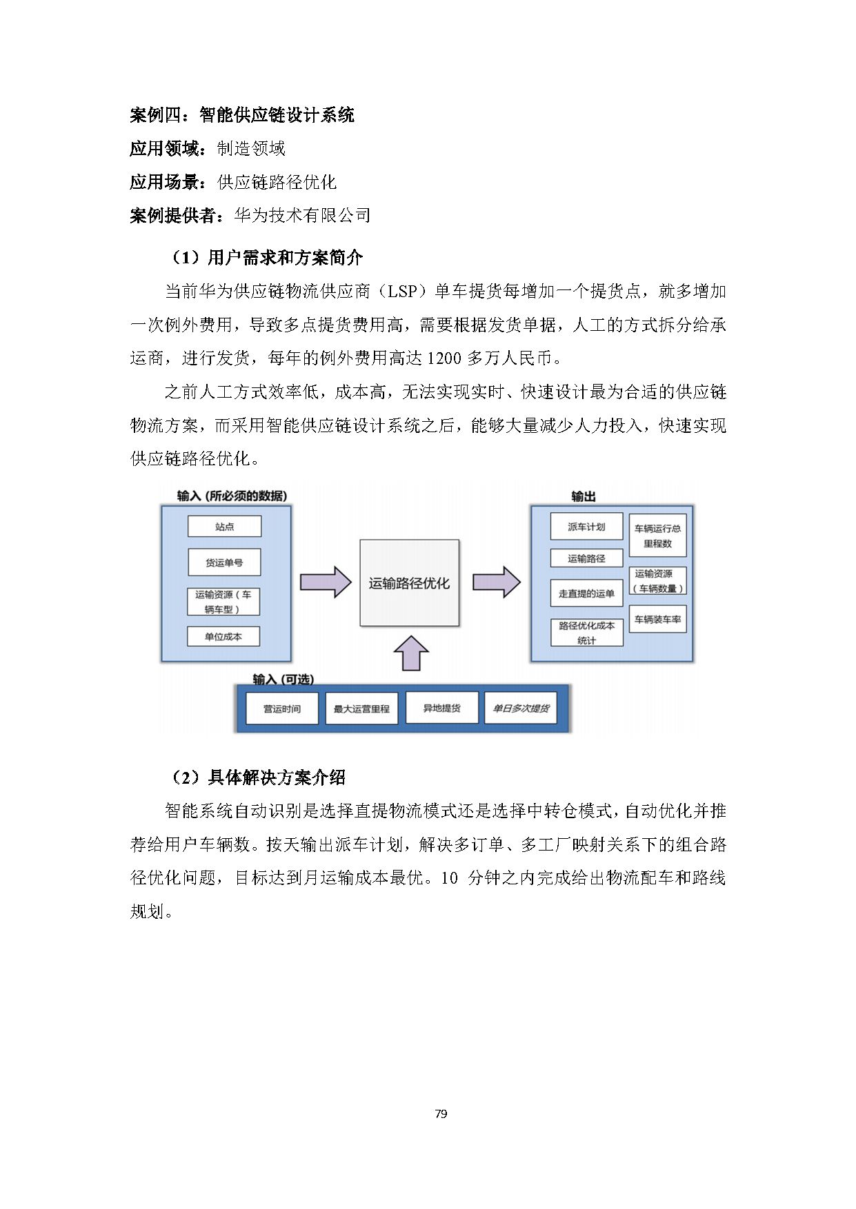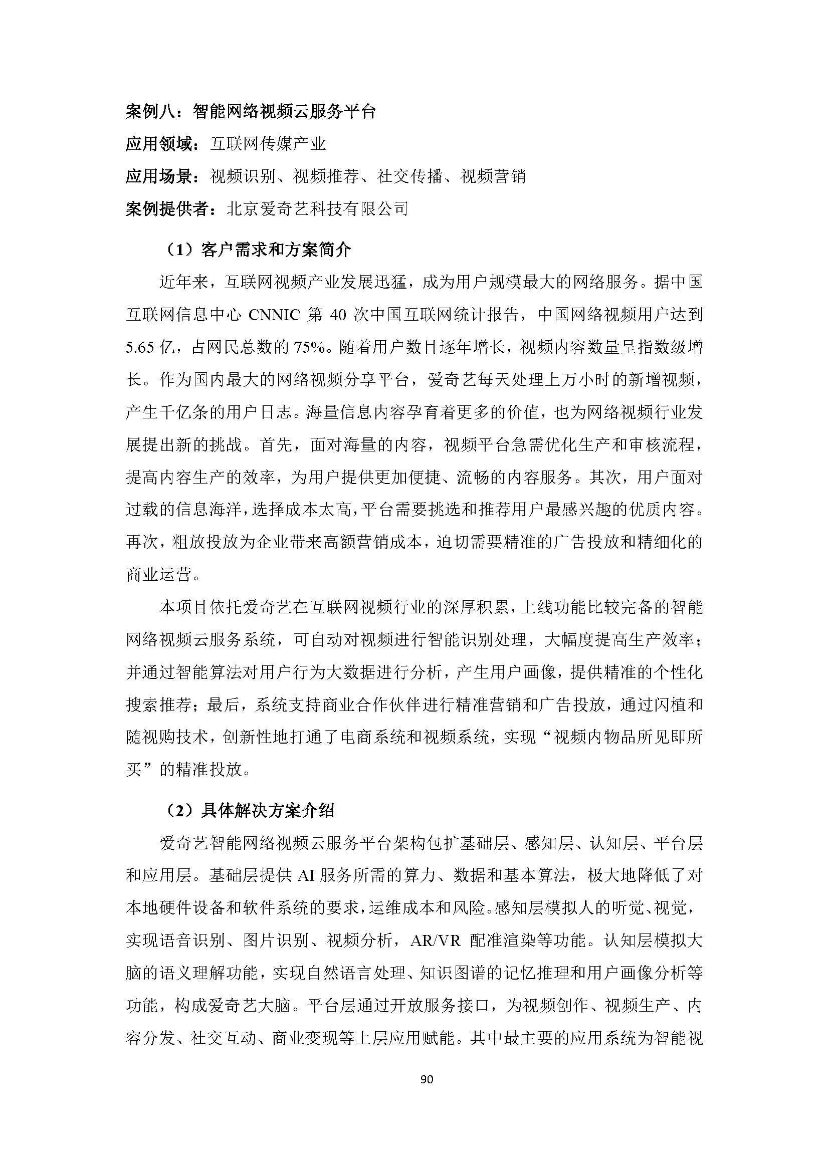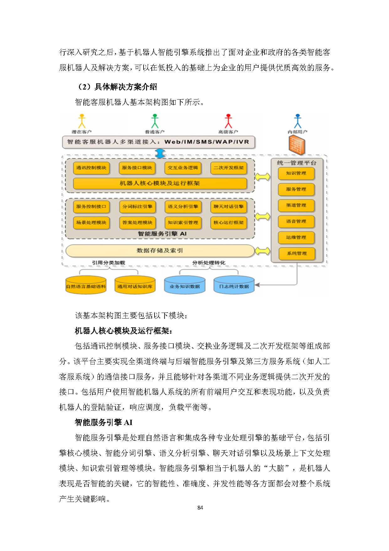 (2)提供人工智能的整体解决方案。此类厂商主要针对用户或者行业需求, 设计和提供包括软、硬件一体的行业人工智能解决方案,整体方案中集成多种人 工智能算法模型以及软、硬件环境,帮助用户或行业解决特定的问题。此类厂商 重点关注人工智能在特定领域或者特定行业的应用。