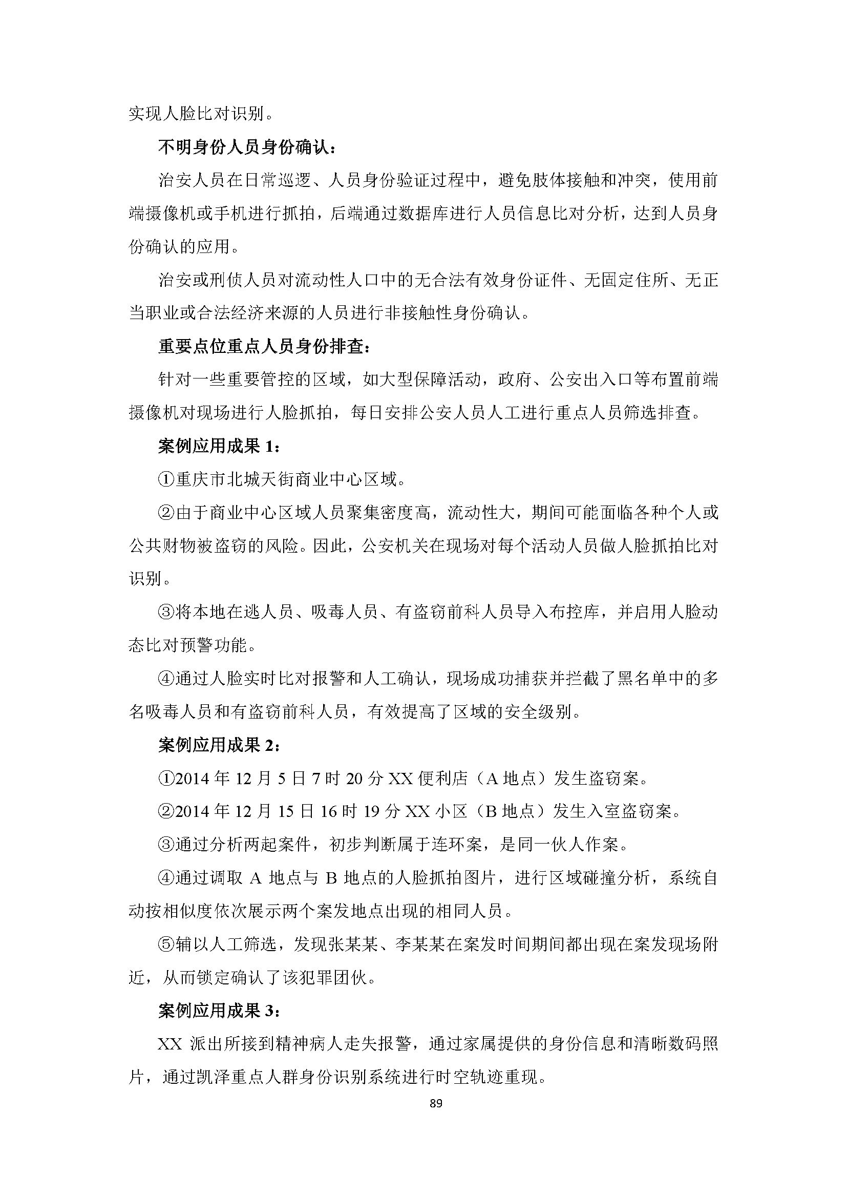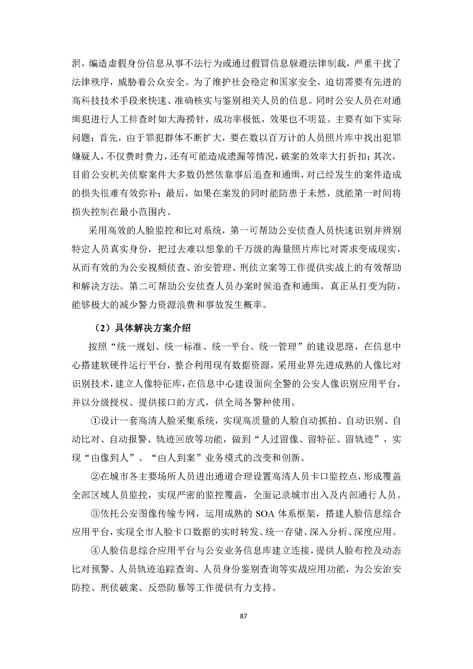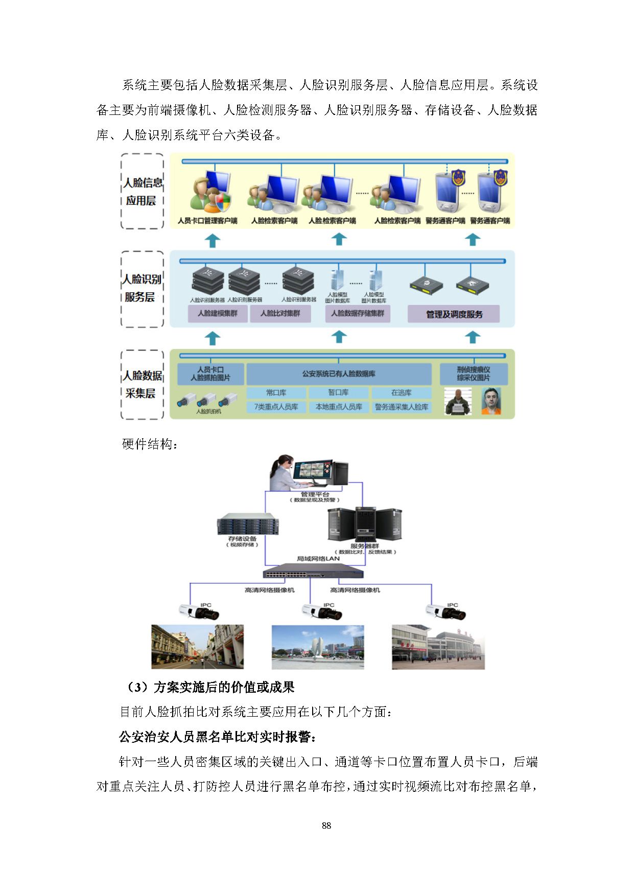 当前,高清视频、智能分析等技术的发展,使得安防从传统的被动防御向主 动判断和预警发展,行业也从单一的安全领域向多行业应用发展,进而提升生产 效率并提高生活智能化程度,为更多的行业和人群提供可视化及智能化方案。用 户面对海量的视频数据,已无法简单利用人海战术进行检索和分析,需要采用人 工智能技术作专家系统或辅助手段,实时分析视频内容,探测异常信息,进行风 险预测。从技术方面来讲,目前国内智能安防分析技术主要集中在两大类:一类 是采用画面分割前景提取等方法对视频画面中的目标进行提取检测,通过不同的 规则来区分不同的事件,从而实现不同的判断并产生相应的报警联动等,例如: 区域入侵分析、打架检测、人员聚集分析、交通事件检测等;另一类是利用模式 识别技术,对画面中特定的物体进行建模,并通过大量样本进行训练,从而达到 对视频画面中的特定物体进行识别,如车辆检测、人脸检测、人头检测(人流统 计)等应用。