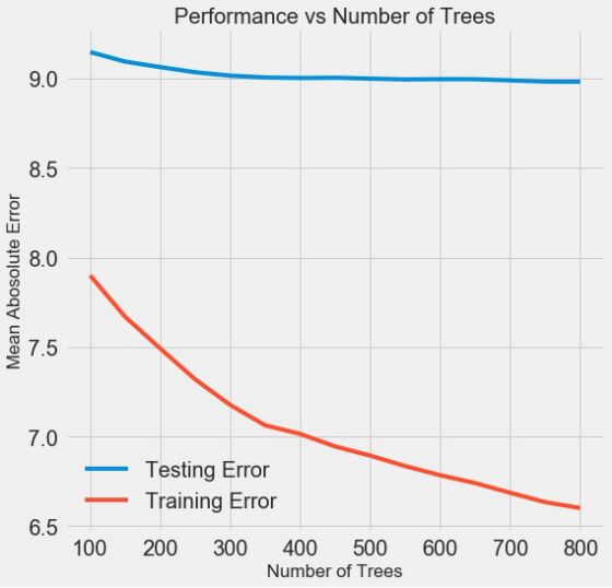 对于最终模型,我们将使用800个估计器(estimators),因为这得到了在交叉验证中的最低误差。现在,测试这个模型的时间到了!